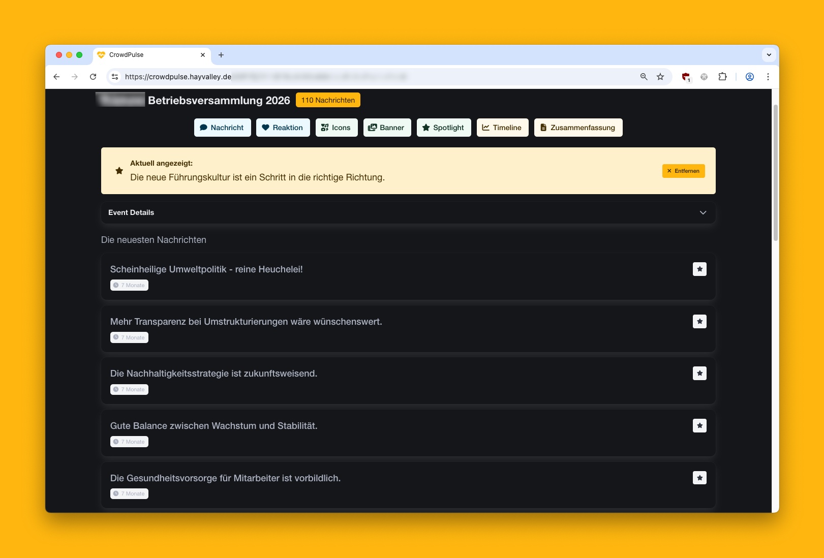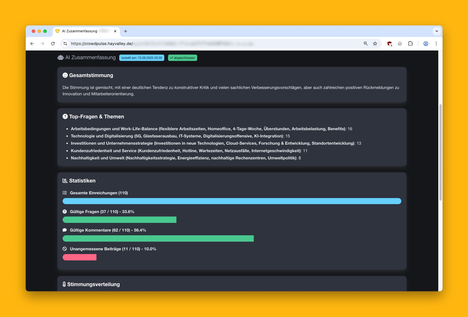 "CrowdPulse significantly simplified audience interaction while professionally structuring it. The low barrier to entry, live delivery, and clear presentation of contributions were a real added value for our event."